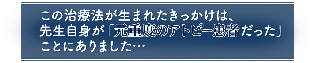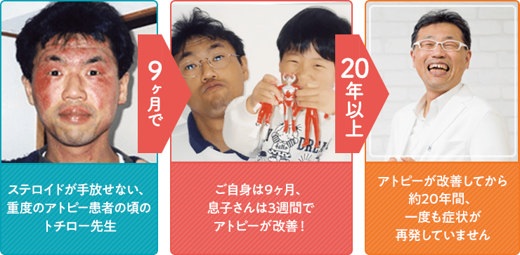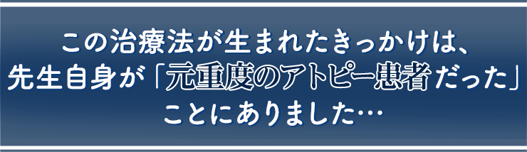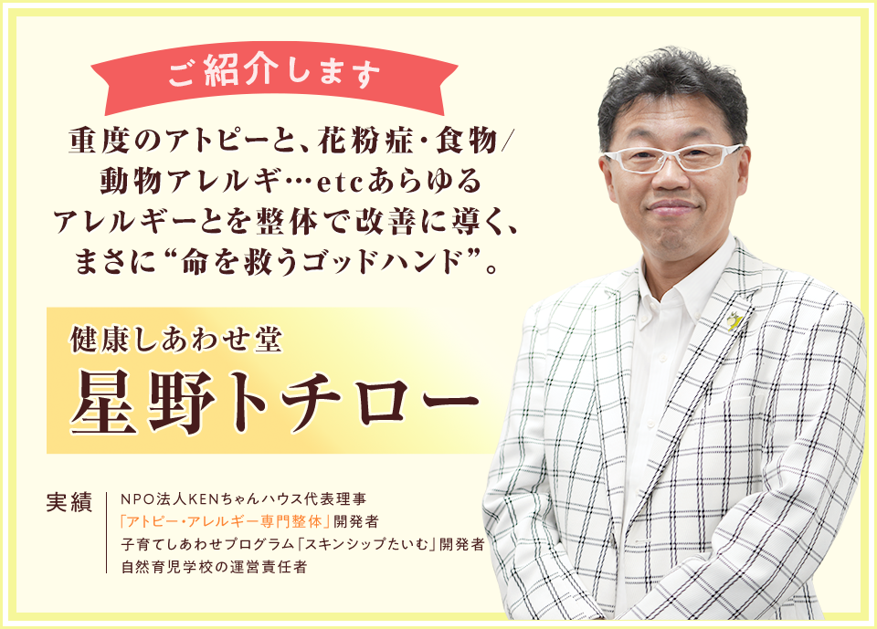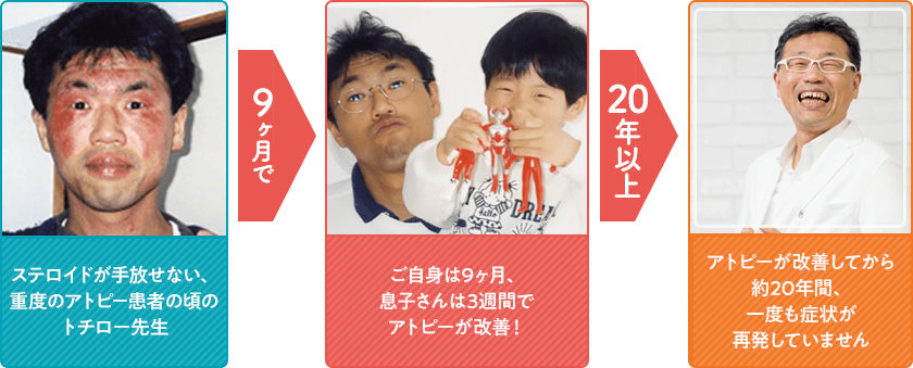 生まれつき最重度のアトピーを患っていたトチロー先生は、30年もの間、痒みや痛み、薬の副作用に苦しんでいました。国立病院、鍼灸、整体、漢方、健康食品、超能力者など…総額500万円かけてもまったく症状が改善せず、「今ある治療法で効果が出ないなら、自分で開発するしかない!」を考えました。そこから研究や臨床を重ね、誰でもできるようになるまで体系化されたのが、この「アトピー・アレルギー克服整体」なのです。