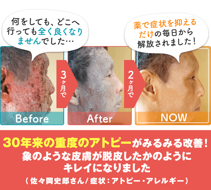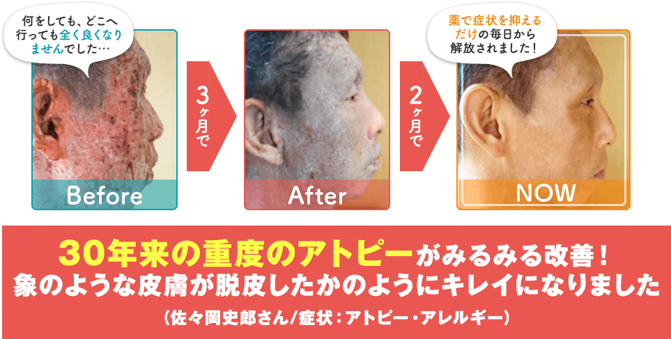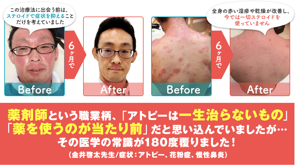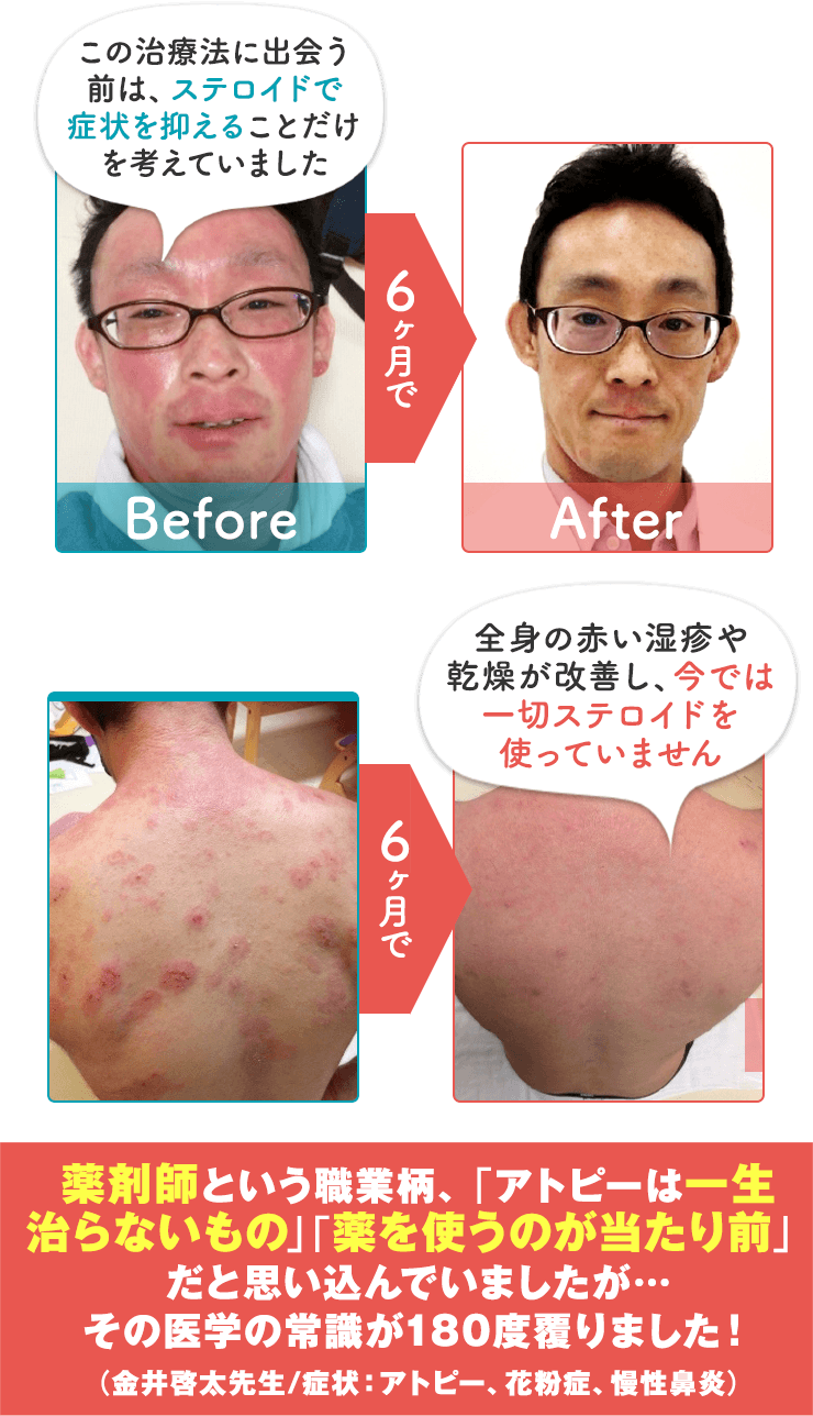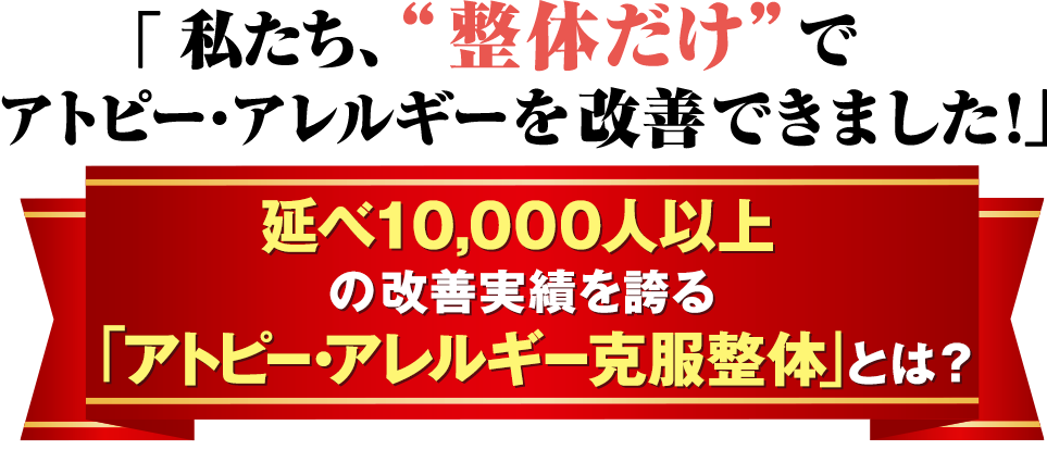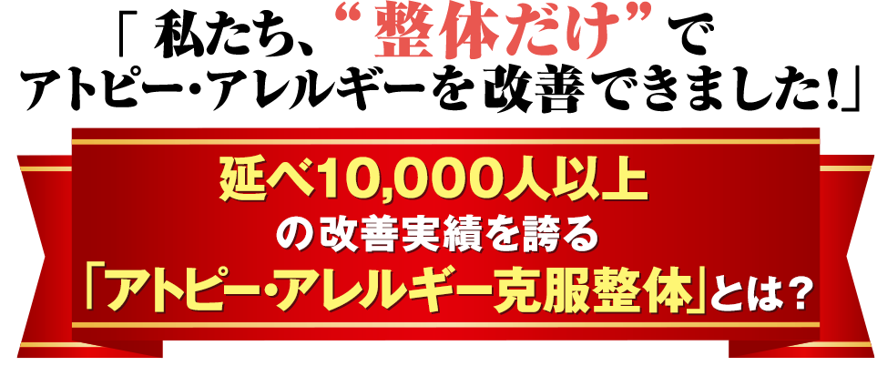 「整体=肩こりや腰痛など、痛みやコリを改善する場所」というイメージが強いですよね。ですが、今回あなたにご紹介する「アトピー・アレルギー克服整体」は、“整体の手技だけ”で、現代医学では対処療法しかないと言われているアトピー・アレルギー症状を根本から改善できる、前代未聞の治療法なんです。その効果の高さは、先ほどご紹介した4名の患者さんの重症度、改善度からおわかりいただけたかと思います。