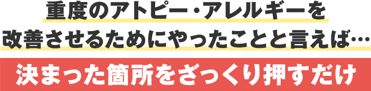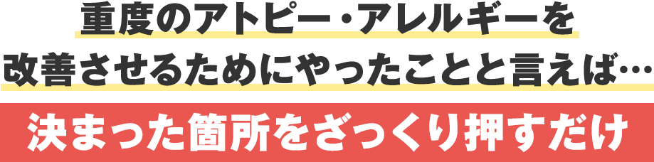 しかし、実はやり方はとってもかんたん。「決まった箇所をざっくり押す」だけなんです。押す時間も長くて20秒ほどしかかかりません。たったこれだけで、どんなに重度のアトピー・アレルギーも改善に導くことができるのです。