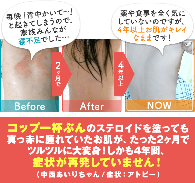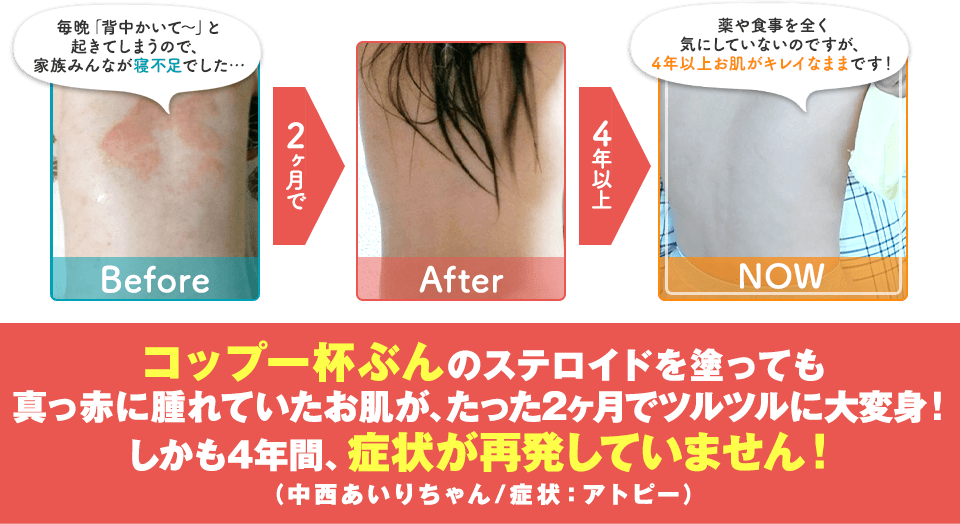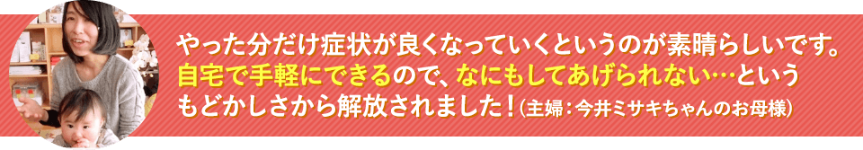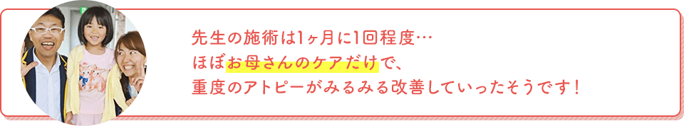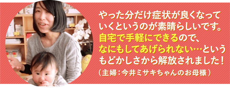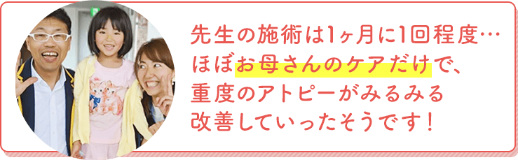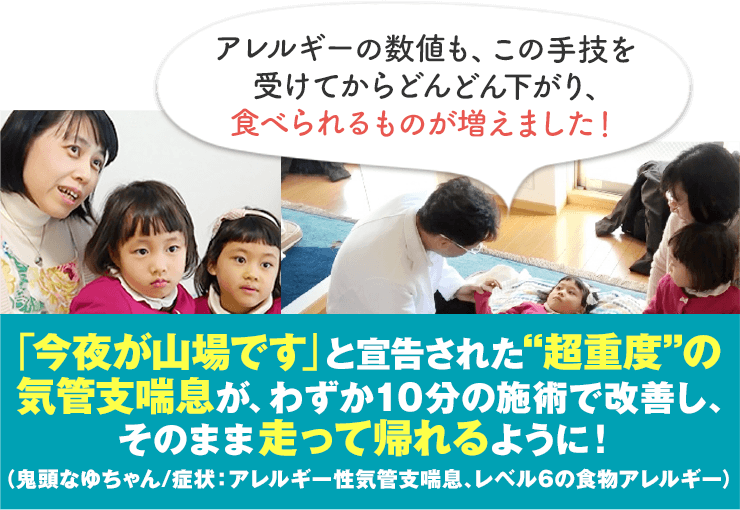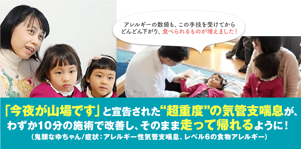 その証拠に、施術未経験のママさんが、この手技を使うことで我が子のアトピー・アレルギーを改善に導いた事例をご紹介しましょう。この事例からも、どれだけ整体知識がない、施術未経験の方でも、ほぼ確実に治療効果が出せる、ということは想像に難くないと思います。どうぞ安心して手技を試してみてください。