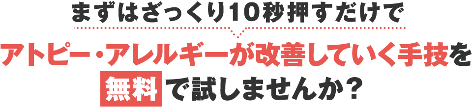 そんなトチロー先生の開発した「アトピー・アレルギー克服整体」を、今だけ無料でお試ししませんか?現在、期間限定で公開している無料手技セミナー映像では、ほんの10秒でアトピー症状・アレルギー症状はもちろん、腰痛や倦怠感といった身体の不調まで改善できるテクニックをプレゼントしています。ぜひ、身近な人や自分自身で手技を試して、その効果を実感してみてくださいね。