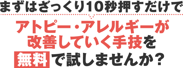 現在、「アトピー・アレルギー克服整体」の手技一部をお試しできる、無料手技セミナー映像が公開中です。ある箇所をざっくり10秒押すだけで、みるみる肌が潤ってきたり、鼻詰まりや息苦しさが改善していくテクニックをプレゼントしています。
